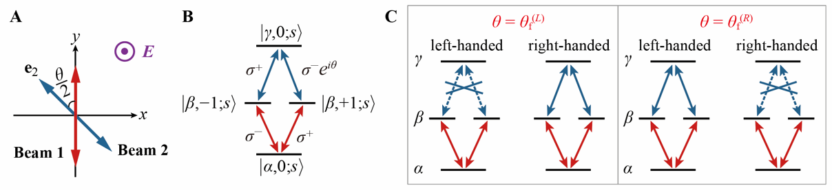 图:(A) 静电场E的方向以及光束1和2的偏振方向;(B) 双光子电偶极跃迁的能级图;(C)手性对映体特定的跃迁:当θ=θfL/R,右手/左手分子的双光子跃迁是允许的,左手/右手分子的双光子跃迁是禁闭的。