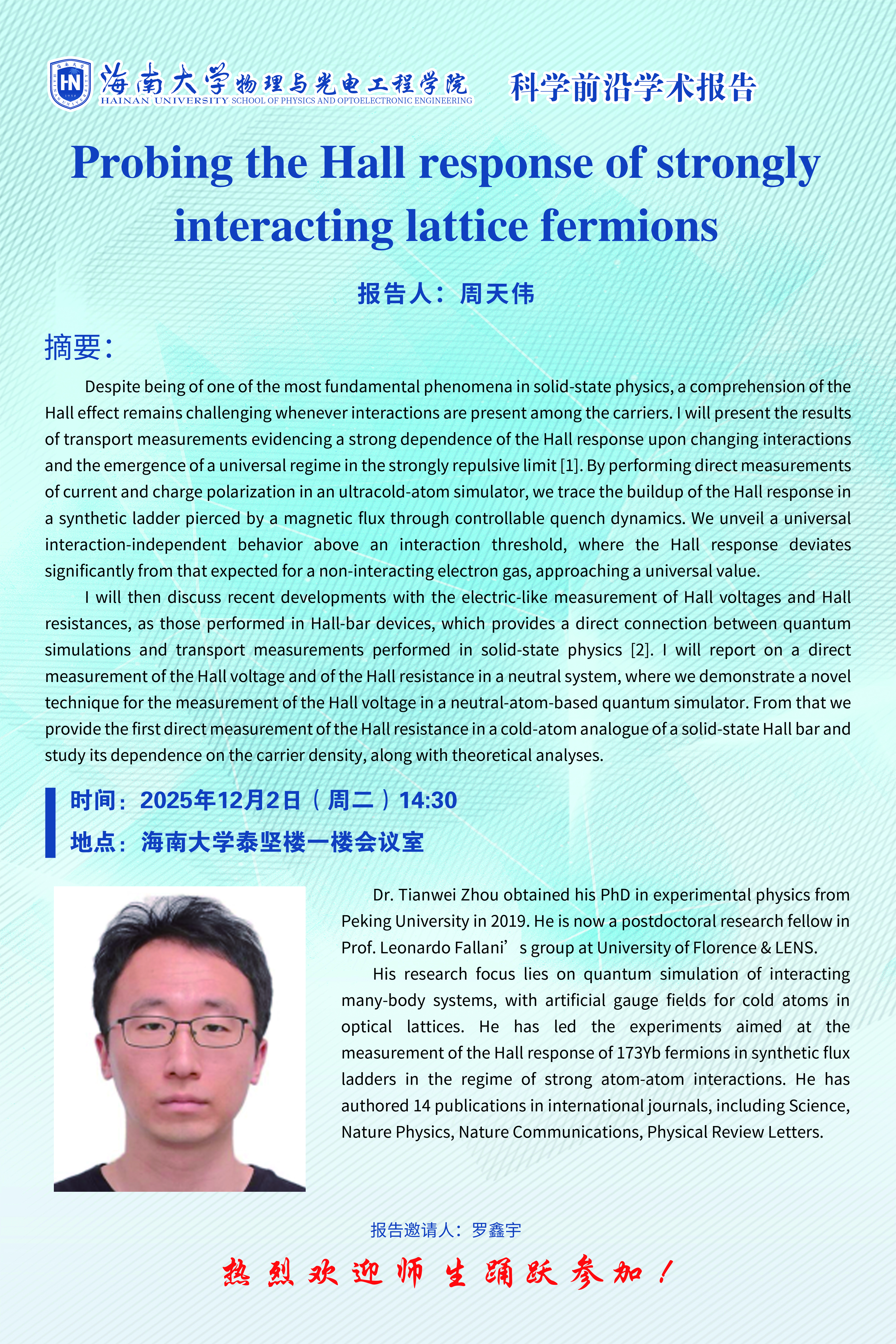 科学前沿学术报告(七十二):Probing the Hall response of strongly interacting lattice fermions