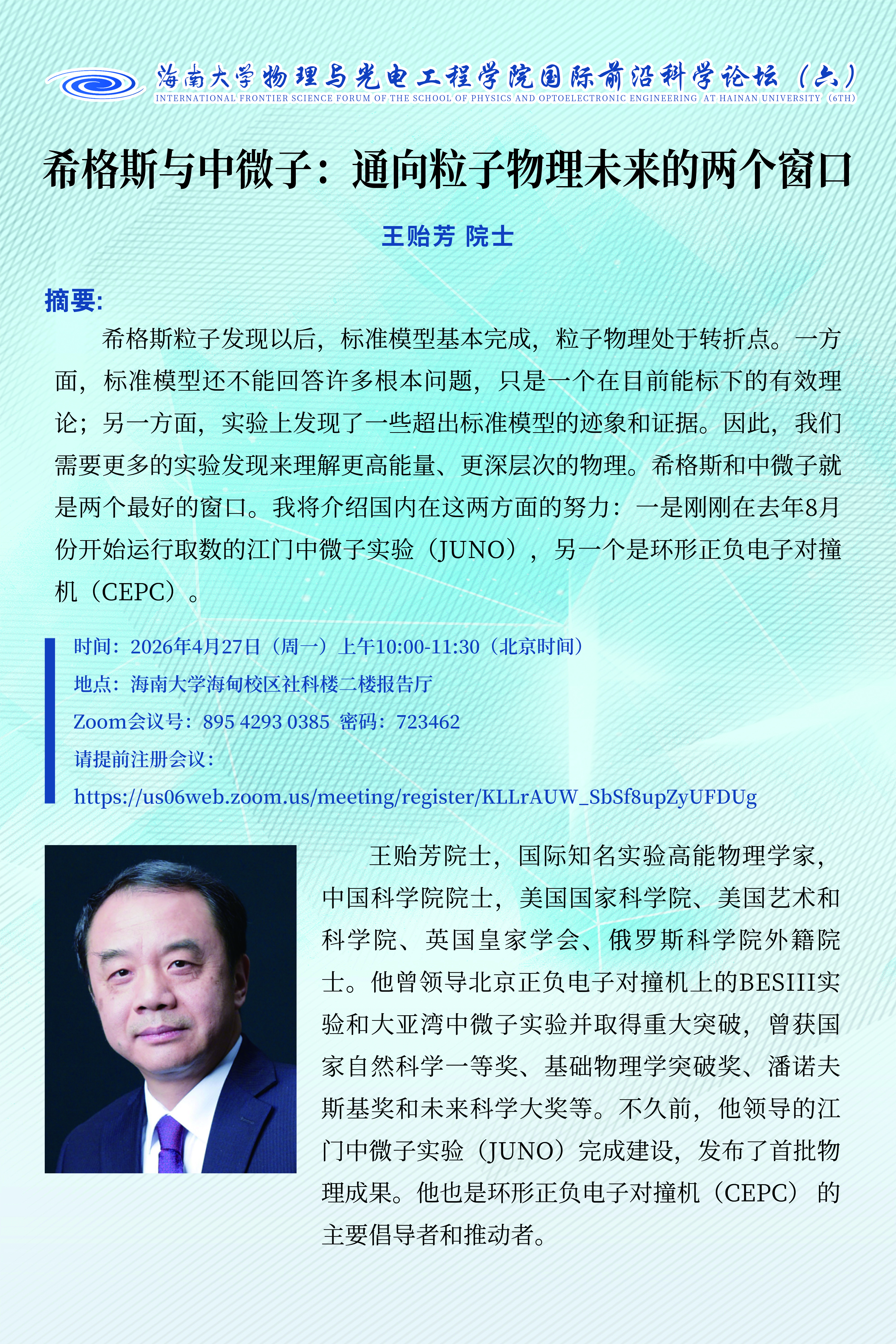 国际前沿科学论坛(六):希格斯与中微子:通向粒子物理未来的两个窗口