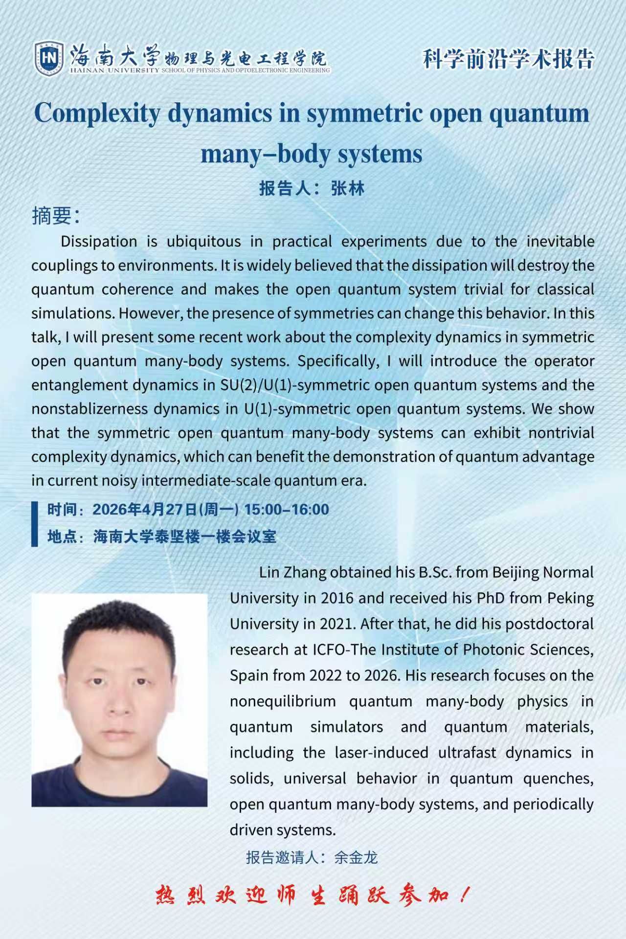 科学前沿学术报告(九十一):Complexity dynamics in symmetric open quantummany-body systems